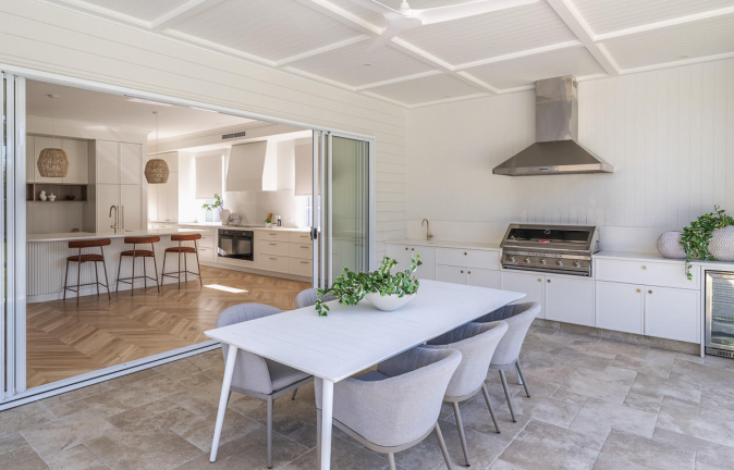 The open plan living and dining domain flows with ease through full-height glass sliders to the alfresco terrace, setting the stage for effortless indoor-outdoor living.