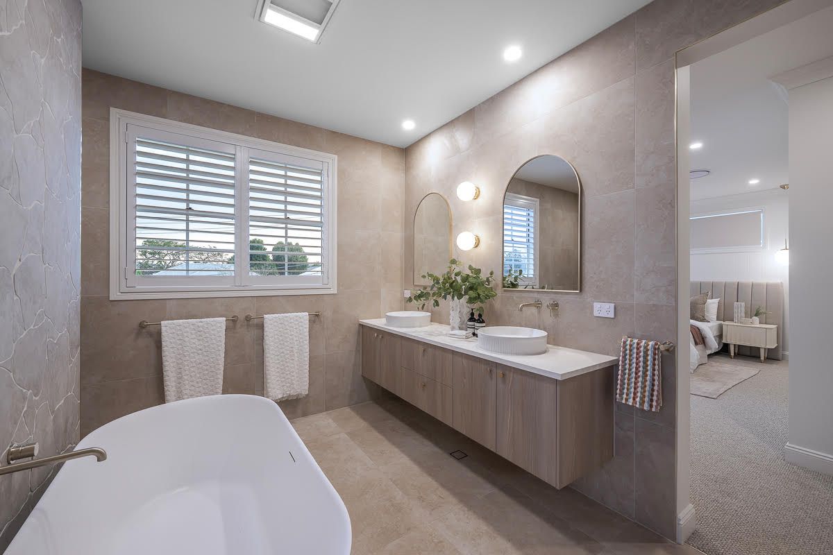 Upstairs, a secondary living space with a study nook provides the perfect haven for children or teens, while beautifully appointed bathrooms feature stone finishes and freestanding bathtubs.