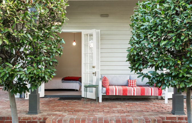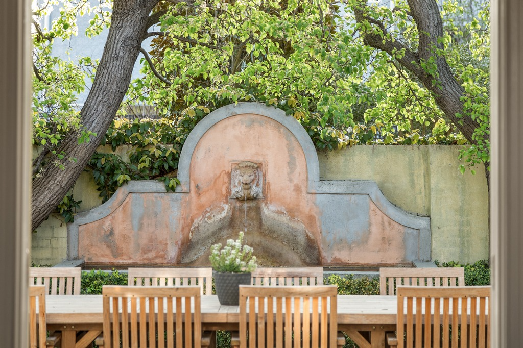 A Boston Ivy feature wall with vivid blue shutters reminiscent of a Mediterranean retreat conceals a solar-heated, salt-chlorinated pool enjoys direct access to a smart second bathroom, while on the block’s northern side, golden and weeping elms, a flame tree, and grand liquidambar offer a delightful backdrop for drinks on a summer evening.