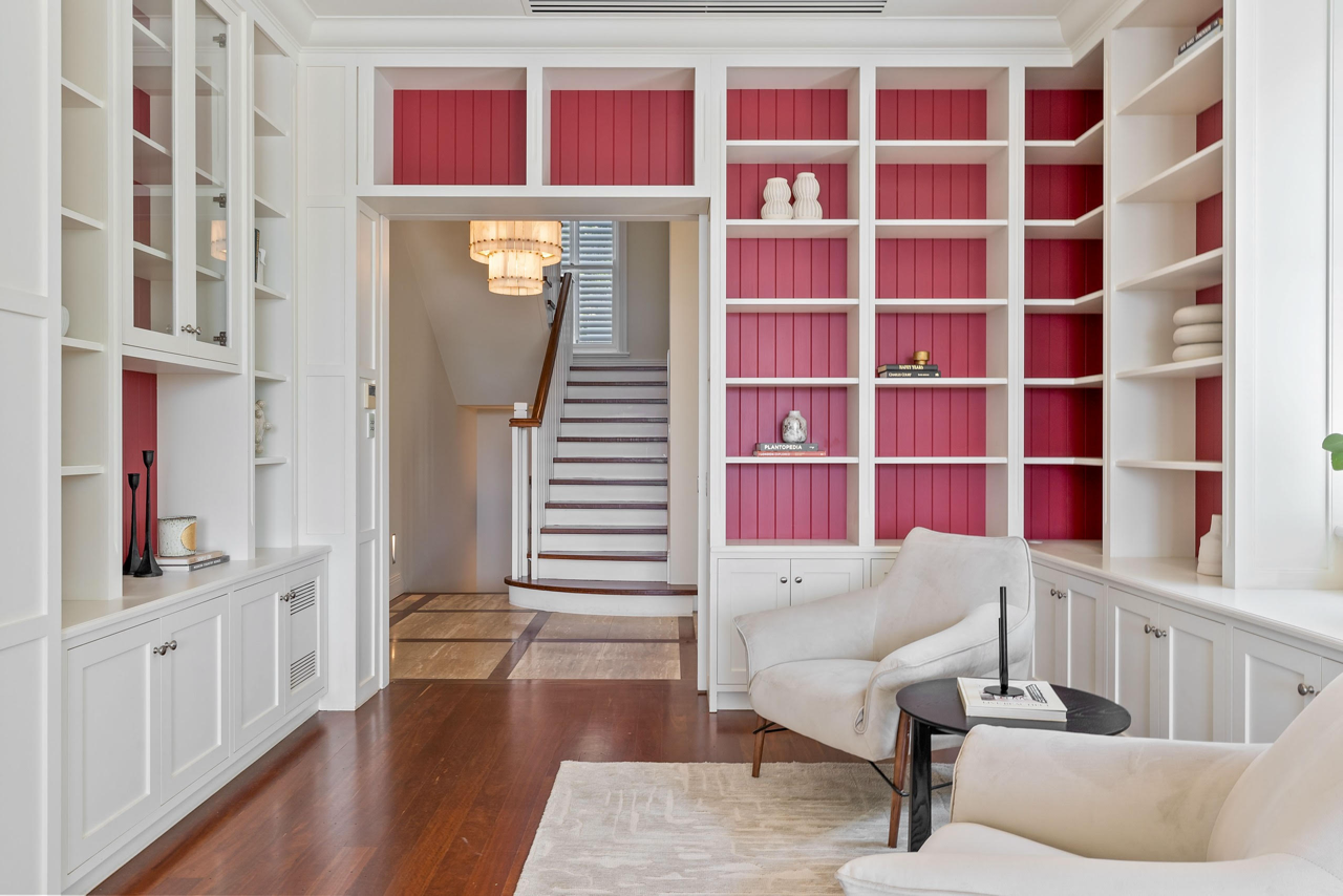 The gourmet kitchen is appointed with integrated Gaggenau appliances, a double oven, sleek overhead cabinetry, marble benchtops and a large island bench. A formal dining room with river views sets the tone for memorable gatherings, while floor-to-ceiling doors open to the lawn, gardens and alfresco terrace.