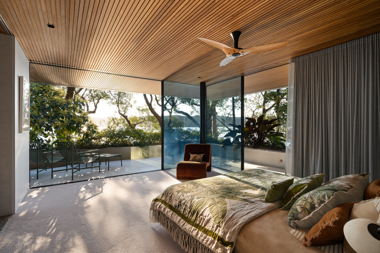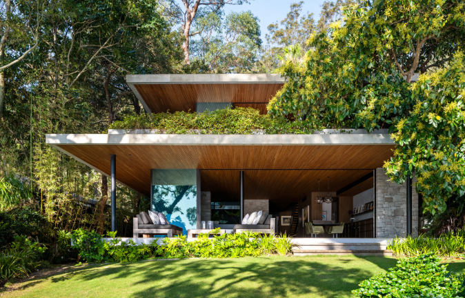 Inspired by the ideals of Brazilian Modernist design, the Brutalist quality of the concrete form is softened by the lush green canopy cascading from the rooftop and rising from the gardens below, blurring the boundaries between indoors and out.