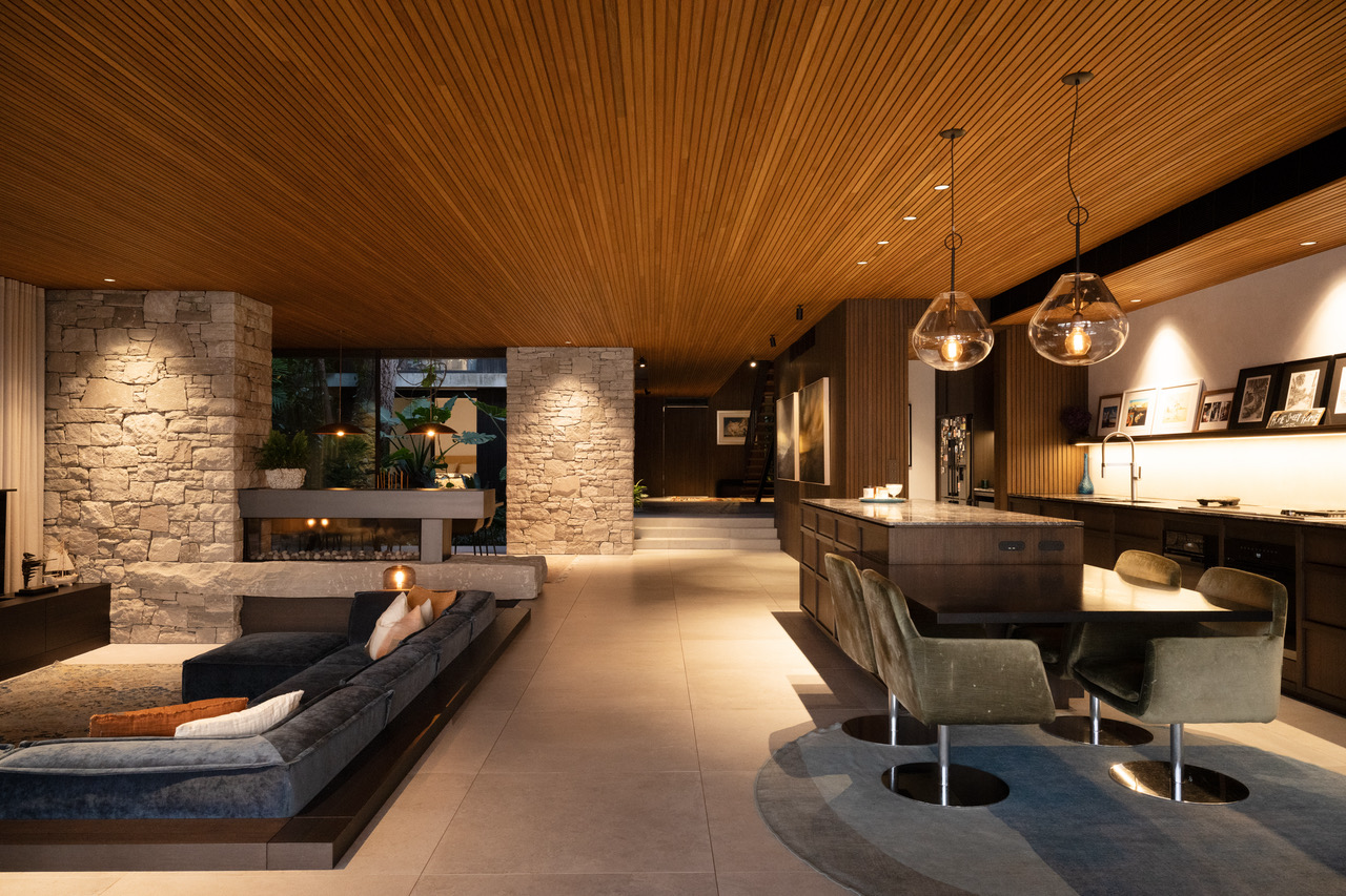 In the sunken lounge, the Escea gas fireplace offers year round comfort, while the Basalte Home KNX automation system controls the DALI lighting, HVAC and floor heating, including full remote access.